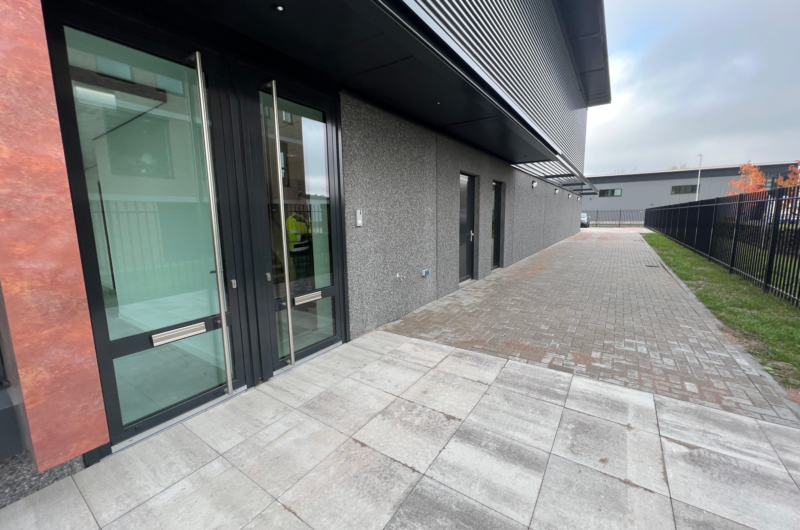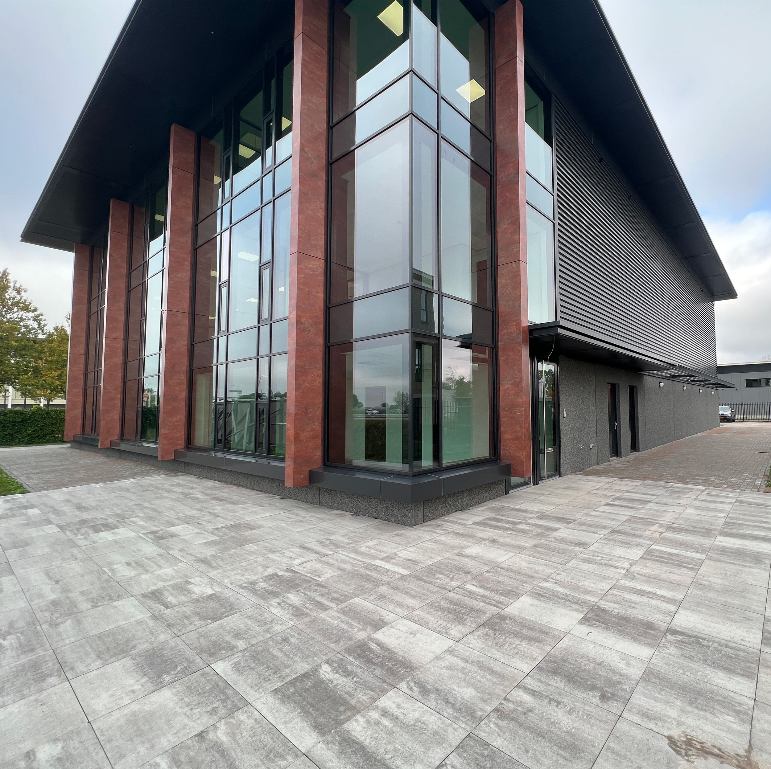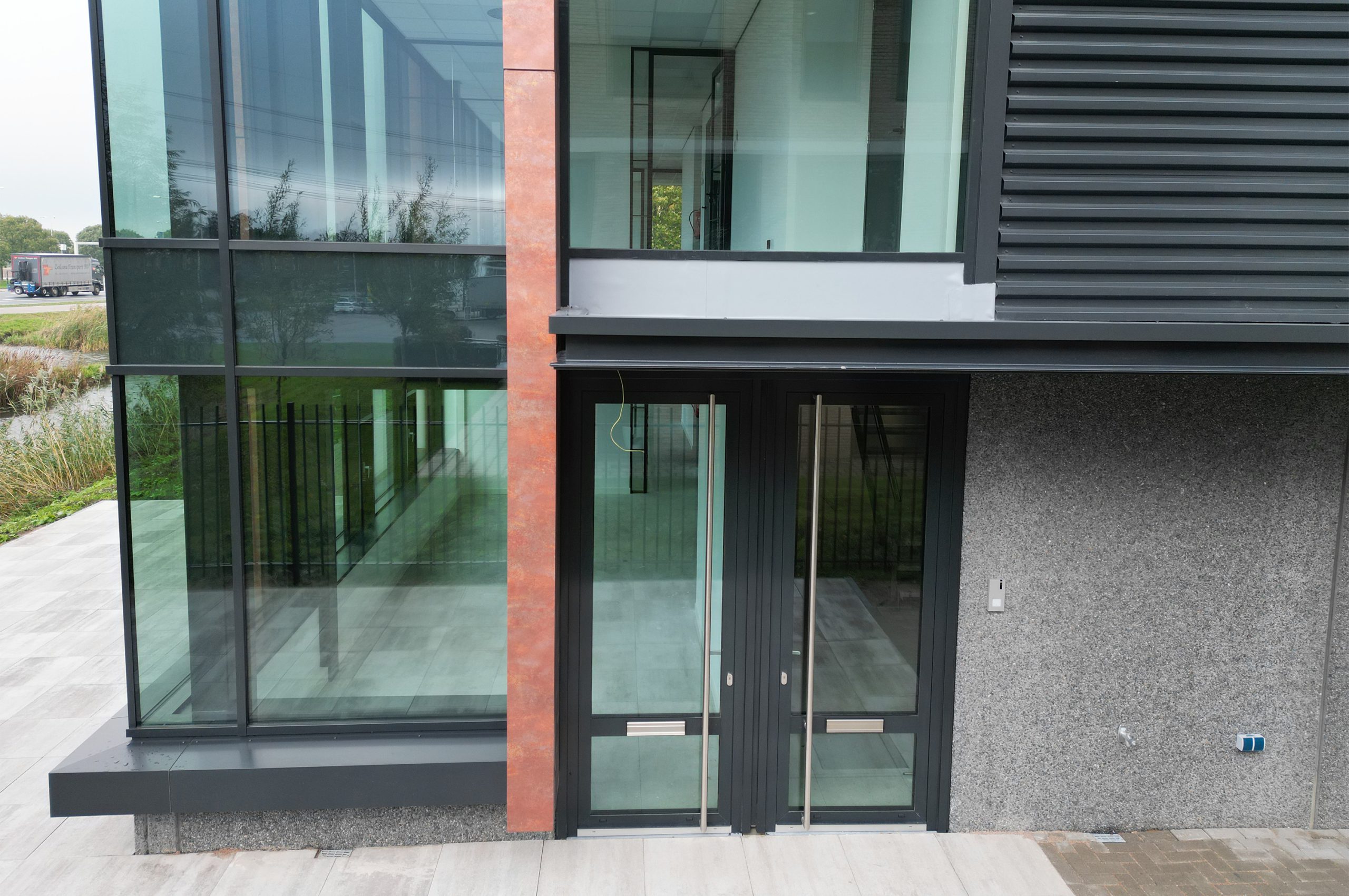 - De kolommen voor de gevelpuien springen eruit en verbijzonderen het pand. Verder is de onderste rand van de bedrijfshal van grindbeton gemaakt, wat zorgt voor een mooi contrast.